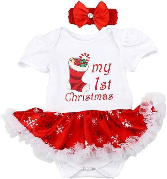 Baby Girls My First Christmas Outfit Newborn Infant 1St Xmas Princess Tutu Romper Dress + Headband + Shoes 3Pcs